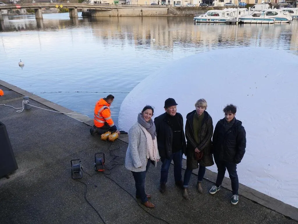 Manuela Gourichon, Jean-Claude Ragaru, Sabrina Lucas et l’artiste, Allan Felisberto, devant la bulle en cours d’installation sur la rivière Sarthe. Le Maine Libre