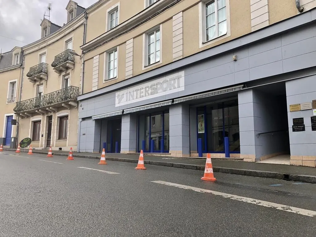 Les locaux de l’ancien magasin Intersport sont vacants depuis 2017, rue Carnot, à Sablé-sur-Sarthe (Sarthe). © Ouest-France
