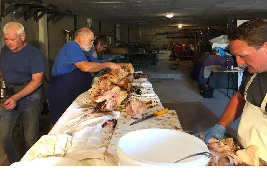 Les cuiseurs s’activent à la découpe du cochon grillé… © Le Maine Libre