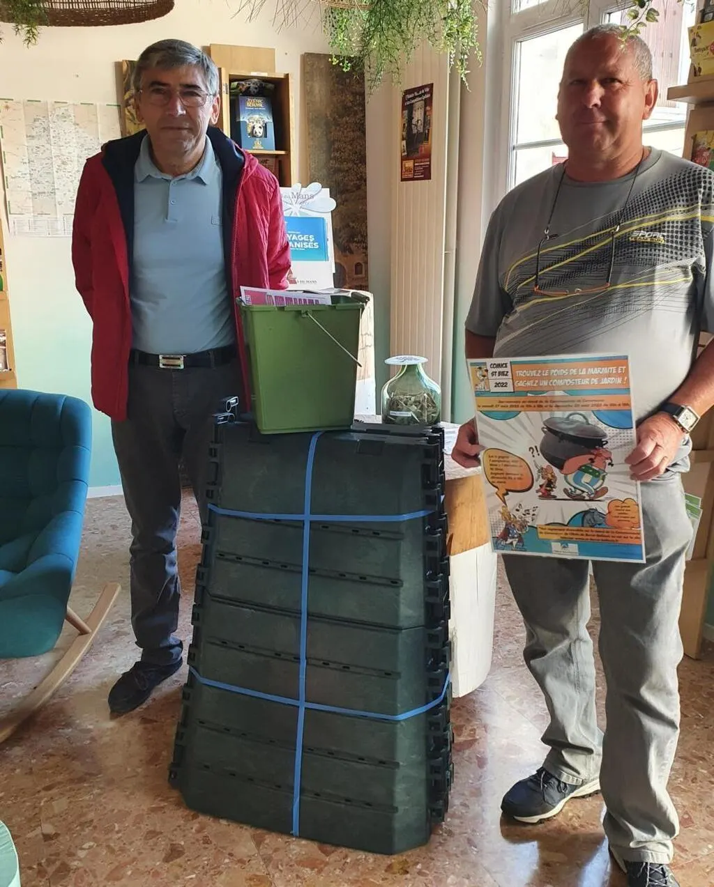 Gérard Lambert a remis un composteur de jardin et un bio seau à André Tessier. © Le Maine Libre