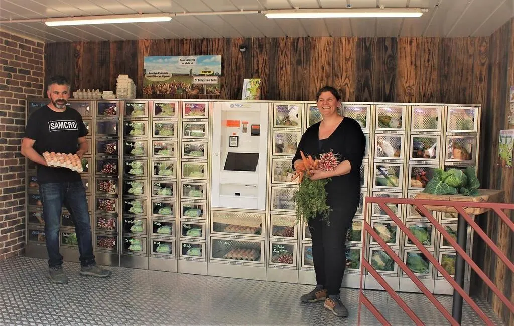Sophie Girard et Bertrand Chartier, maraîchers à Saint-Gervais-en-Belin (Sarthe), ont inauguré mi-mai 2023 leur deuxième distributeur de produit frais. Ils proposent leurs propres productions.