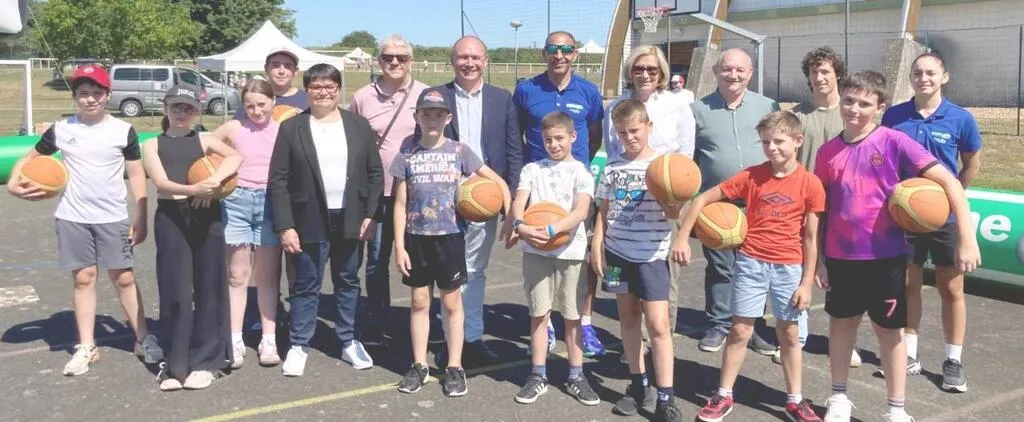 Les enfants de l’atelier volley en compagnie des élus Frédéric Beauchef (au centre), Véronique Rivron, Philippe Richard, Sandrine Plessix et de Mohammed Serbouti, ancien sportif de haut niveau. © Le Maine Libre.