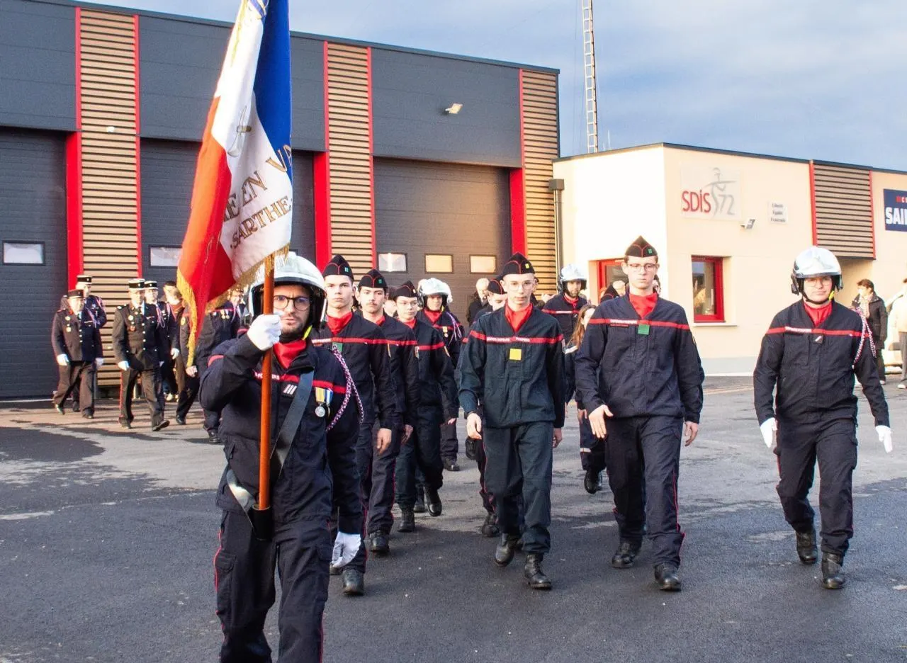 Tous les membres du centre de secours de Saint-Cosme-en-Vairais avaient répondu présent à l’appel lancé à l’occasion de la Sainte-Barbe. Les sapeurs-pompiers s’étaient rassemblés à la nouvelle caserne. Le cortège s’est mis en ordre de marche, précédé par la fanfare de Saint-Vincent-des-Prés, le porte-drapeau étant à la pointe, les officiers, officiels et invités formant l’arrière. Le parcours était tracé : départ du centre de secours, traversée de la ville jusqu’au monument aux morts et retour à la caserne.