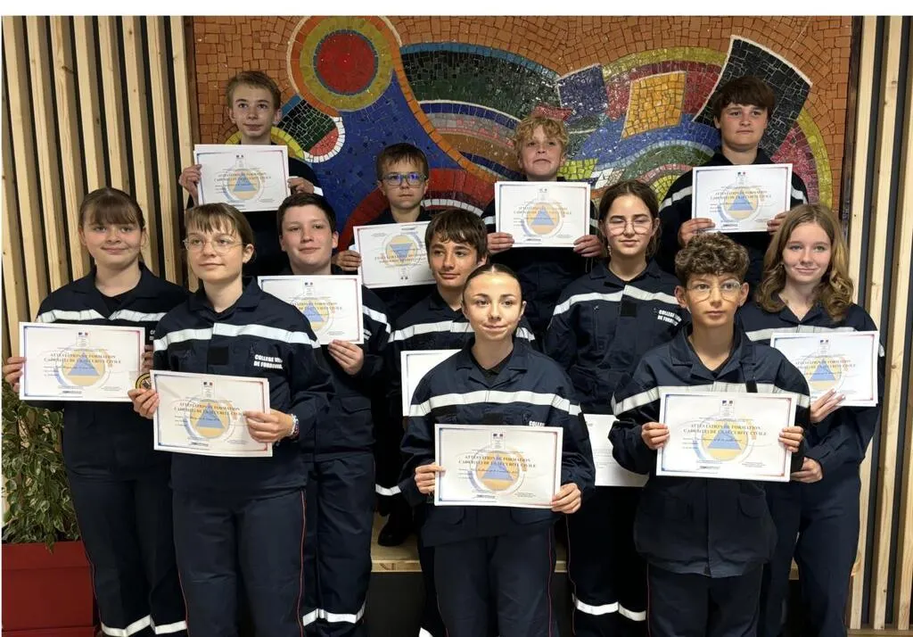 Cette année de formation s’est achevée le lundi 17 juin par une cérémonie au collège. Les 12 élèves, accompagnés de leurs parents, ont été félicités et ont reçu le brevet d’attestation de participation à la classe de cadets et le diplôme PSC1 (Prévention et secours civiques de niveau 1). Le principal du collège a tenu, quant à lui, à faire réaliser des rondaches (écussons) aux couleurs des sapeurs-pompiers et en a remis un exemplaire à chaque stagiaire.