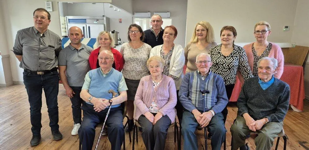 Les doyens Germain et Madeleine Hubert, entourés d’Henri Legendre et Georges Grémillon, aux côtés de des bénévoles. © Le Maine Libre