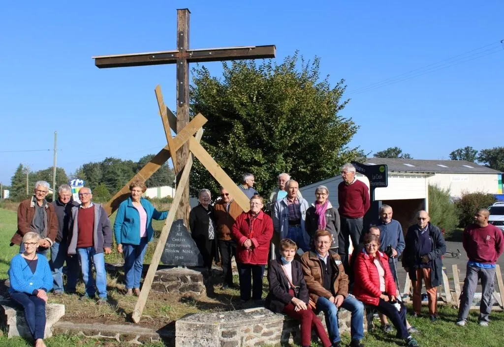 La croix de Fromenteau a été posée samedi, en présence des bénévoles de la Clef de voûte et des habitants du voisinage. © Ouest-France