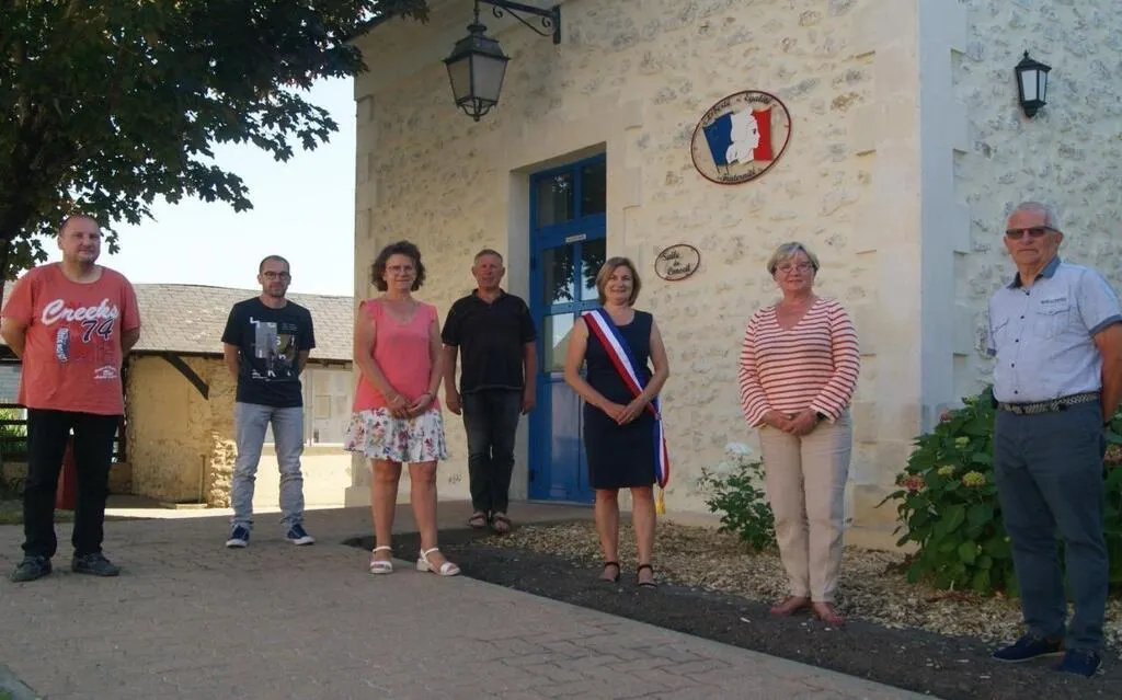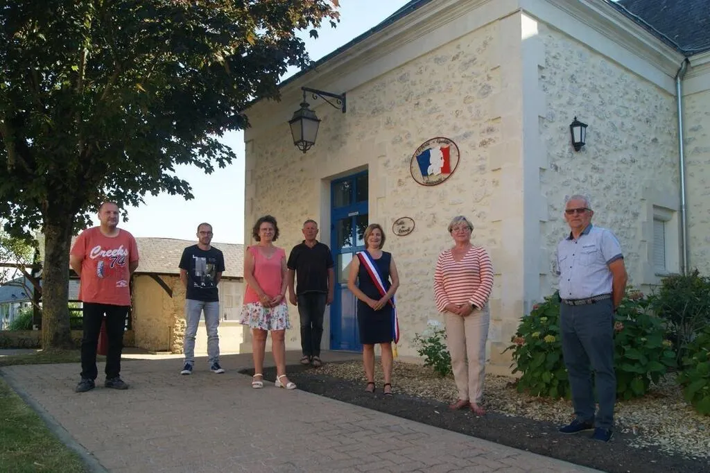 De gauche à droite : Christophe Lalou, Laurent Cochonneau, Claudine Bizot, Jean-Yves Bourges Mathilde Plu la nouvelle maire, Marie-Line Revel et Christian Barbeau. © Ouest-France