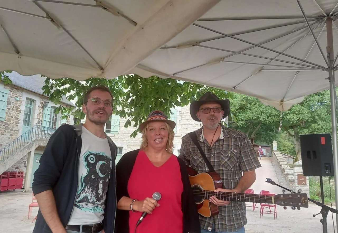 Pour le dernier jour des Beaux dimanches, le public a eu droit à deux concerts gratuits sous le châtaignier : celui donné, en première partie, par Cyrill Émissaire, seul avec sa guitare, puis par le duo appelé Mysticodd, composé de Nicolas, guitariste, et de Laurence, chanteuse.