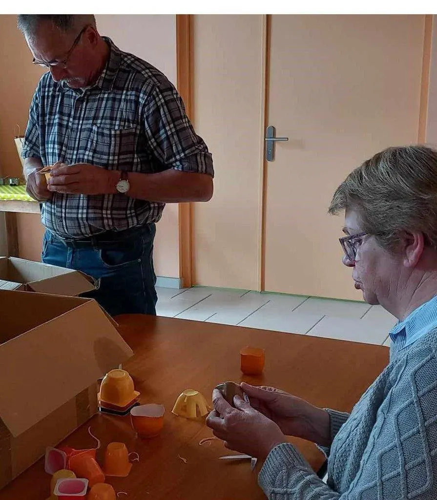 Des pots de yaourts en plastique recyclés en jolies fleurs colorées par les mains expertes des bénévoles. © Le Maine Libre
