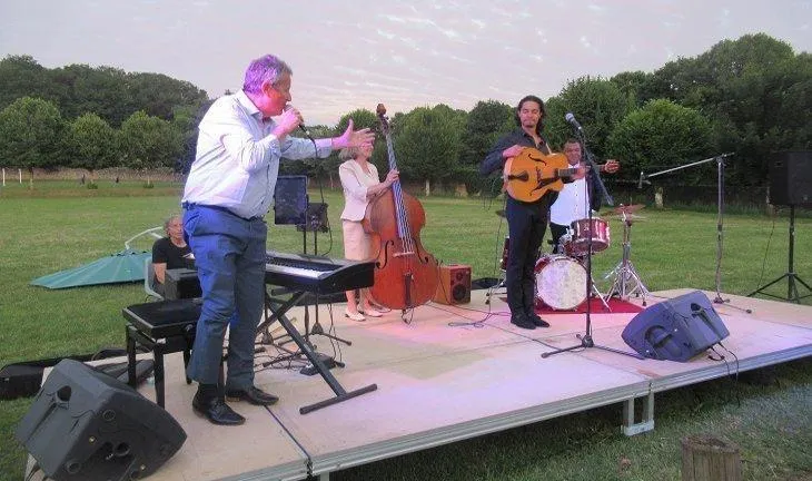 Le 5e concert de jazz n’a pas eu lieu dans l’église mais a invité les musiciens et le public, dimanche, à se rencontrer en plein air, derrière l’église. Le beau temps a offert un merveilleux concert champêtre avec le quatuor sarthois Philippe Duchemin (pianiste), Patricia Lebeugle (contrebasse), Jean-Pierre Derrouard (batterie), Timothé Isnard (guitare).