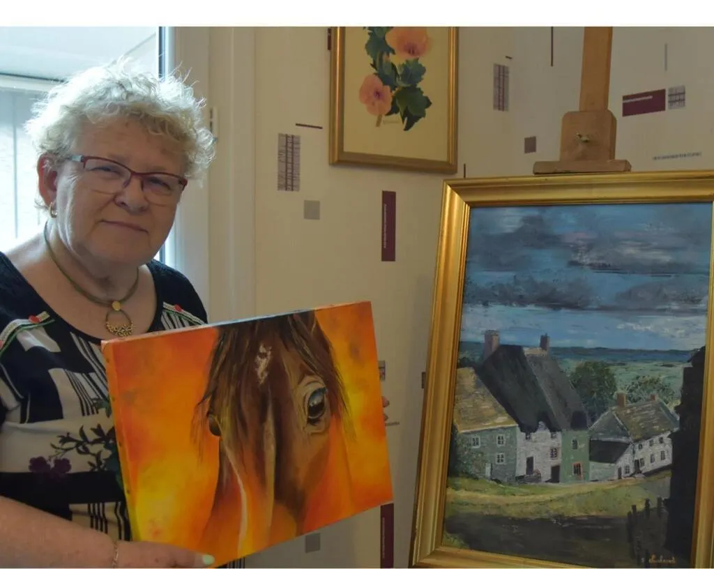 Clairette présentant un de ses tableaux aux côtés d’une toile de Jeannine. © Le Maine Libre