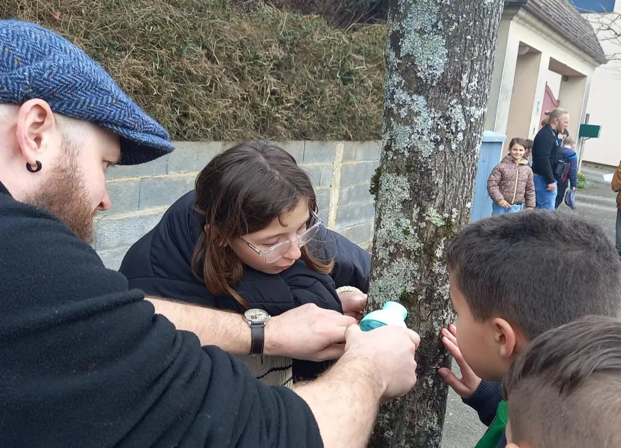 Mardi 10 mars, les élèves de CM2 de Mickaël Pitou, ont suivi une formation dirigée par Morvan Debroize. Au programme, repérer sur l’écorce des arbres autour du lac puis sur la route départementale qui passe dans le bourg, les différents lichens existant, les répertorier, les nommer, les observer au microscope.