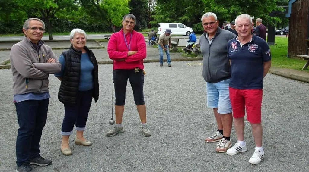 Philippe Desile, le président du club de pétanque (à gauche) avec quelques adhérents dont Bernard Tronchet, le trésorier (2e à droite). © Ouest-France