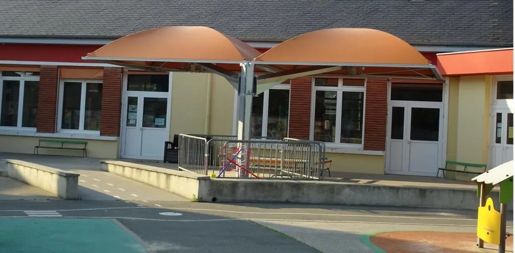 Dans la cour de l’école maternelle, une ombrière a été installée par une entreprise de La Bazoge, afin d’abriter les bambins. © Ouest-France