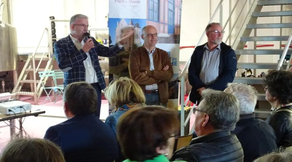 Éric Bourge, vice-président de Maine Cœur de Sarthe ; Samuel Hamelin et Jean-Michel Lerat ont lancé la saison touristique de Maine Cœur de Sarthe à la brasserie Bizarre. © Ouest-France