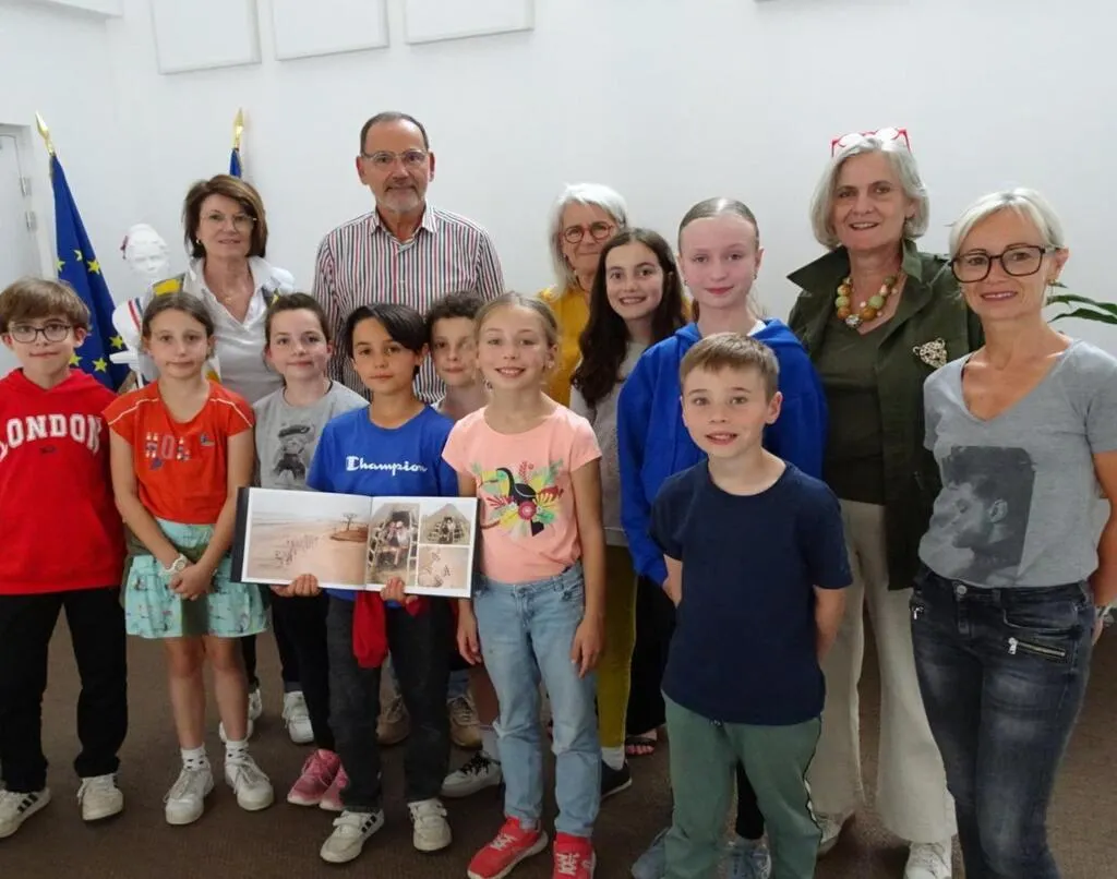 Sonia Guyard (à droite) est venue présenter aux élus et aux enfants du conseil municipal la course Sénégazelle en vidéo et par un livre photo. Ils avaient collecté et remis 40 kg de fournitures scolaires à distribuer. © Ouest-France