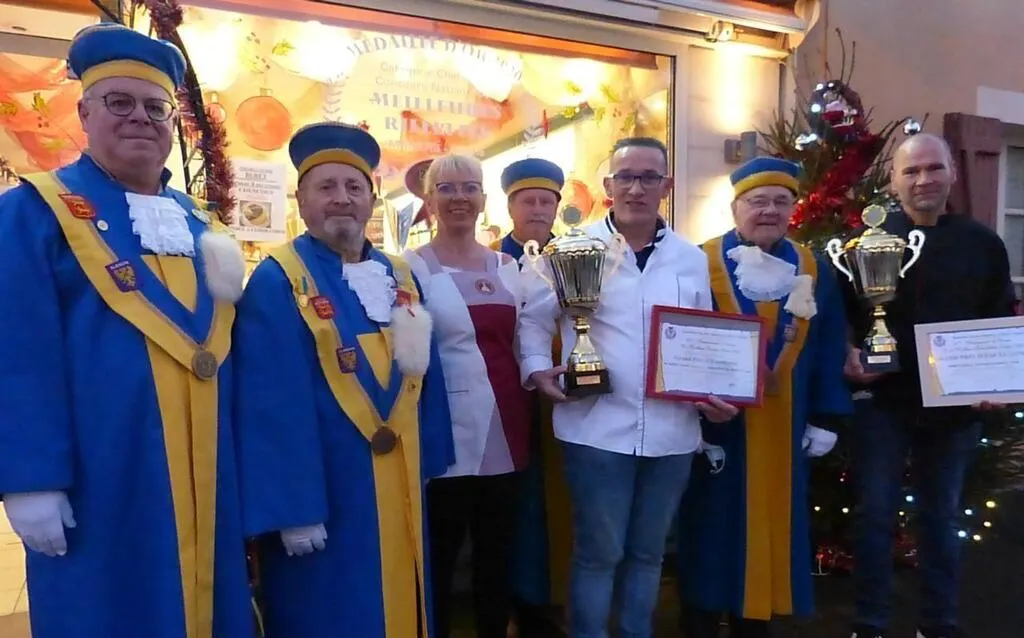 Les membres de la Commanderie des fins goustiers ont remis deux prix d’excellence qui distinguent le travail d’isabelle et Pascal Buret ainsi que celui de leur chef de production, Alain Chevalier © Le Maine Libre