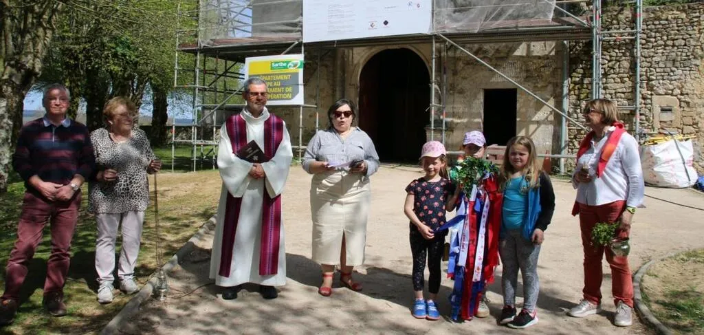 Samedi 5 avril, Fabienne Ménager, maire, accompagnée de membres du conseil municipal a convié la population et les scolaires de Regroupement pédagogique intercommunal (RPI) de la Bienne, à partager la bénédiction par le curé Emmanuel Jamin, de la paroisse de Mamers et du Saosnois, et la pose sur la croix au sommet du clocheton par Joël Godmer, premier adjoint, d’une couronne ornée de rubans multicolores réalisée lors d’ateliers manuels des scolaires du RPI. « Voilà un peu plus d’un an nous lancions une collecte de dons parrainée par la Fondation du patrimoine, pour les travaux de restauration de notre chapelle. De nombreux donateurs (92) ont participé à la collecte de dons à hauteur de 19 468 €, soit 54 % du montant des travaux sur les vitraux (342 500 HT subventionnés à 77 % par l’État, la Région et le Département). Une inauguration est prévue au dimanche 14 septembre, lors de la messe du traditionnel pèlerinage », détaille Fabienne Manager.