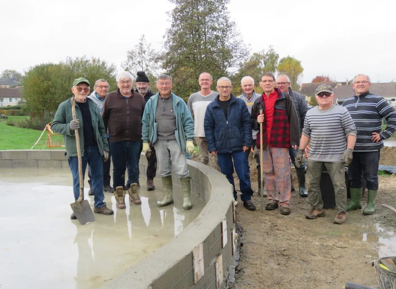 14 bénévoles des trois communes de l’Antonnière étaient réunis vendredi matin pour couler le béton du mur extérieur du nouveau petit bassin. À 11 h, le muret en béton était fini.