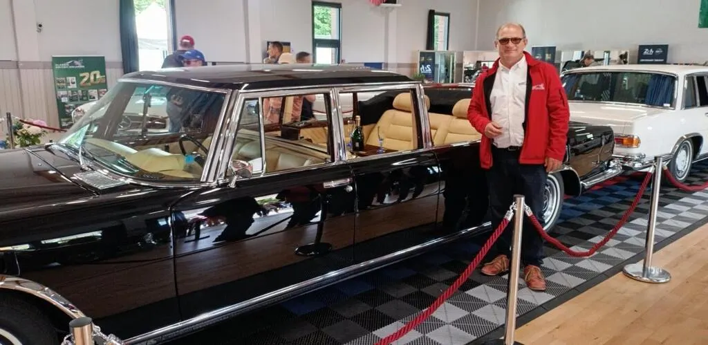 Sur les neuf anciennes Mercedes exposées (thème de la 25e édition), il y en a une qui a fait sensation ! Il faut dire que sa partie arrière décapotable et sa petite table entre les sièges attirent l’œil. Cette voiture longiligne est une série spéciale 600 et est un modèle unique qui date de 1964 !  Cette voiture appartient à l’Atelier 600, un garage situé à Évreux… »,