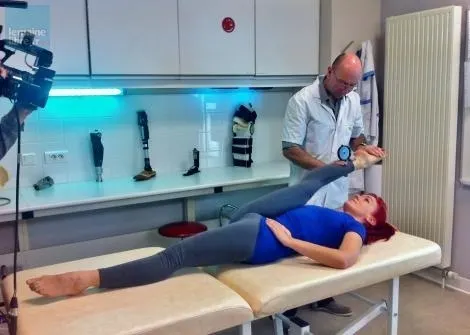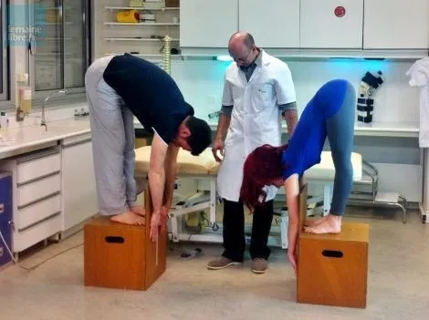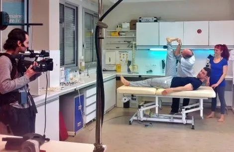 Le docteur Ritz du centre de l'Arche explique les secrets de la contorsion devant les caméras de France 5. © Photo "Le Maine Libre"