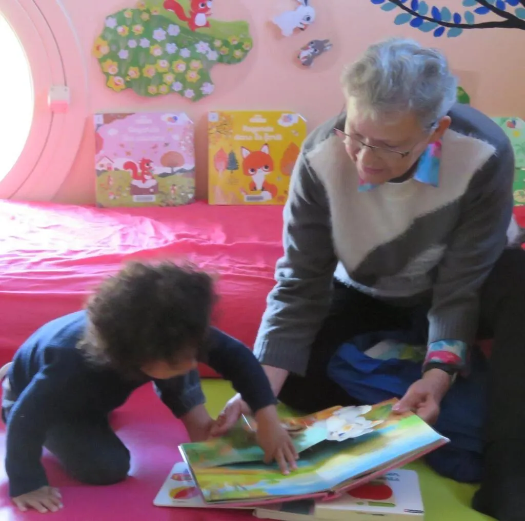 Odile, bénévole à la bibliothèque de Saint-Saturnin avec Kayden, 3 ans. © Le Maine Libre