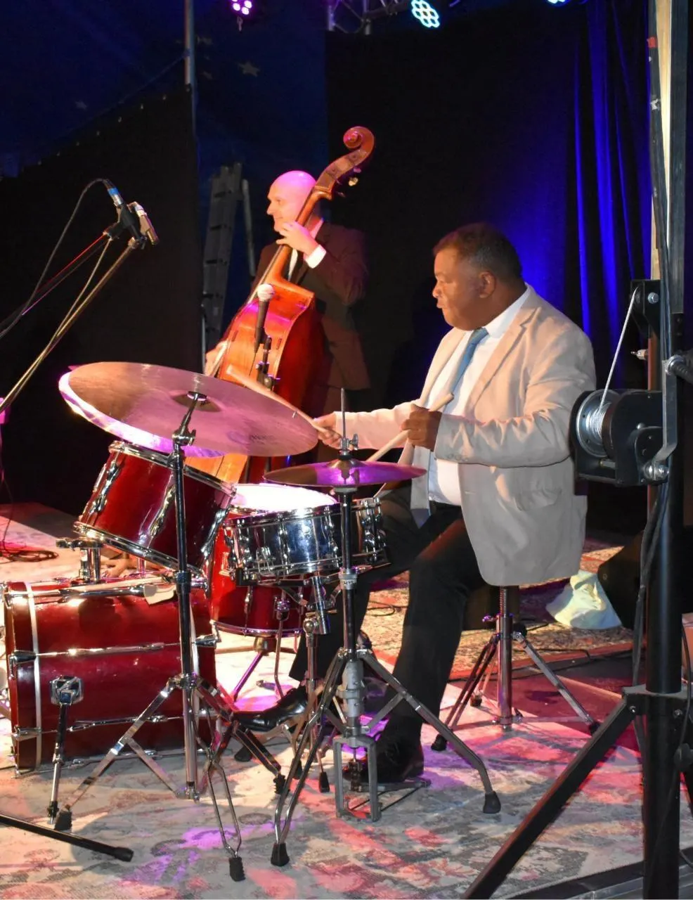 Jean-Pierre Derouard, reconnu pour son talent de batteur, a mené son groupe à travers un répertoire qui a su capturer l’essence et l’énergie du jazz classique. Le public, rassemblé sous un chapiteau, a été transporté dans une époque où le jazz était roi, grâce à des interprétations vibrantes et pleines de passion.