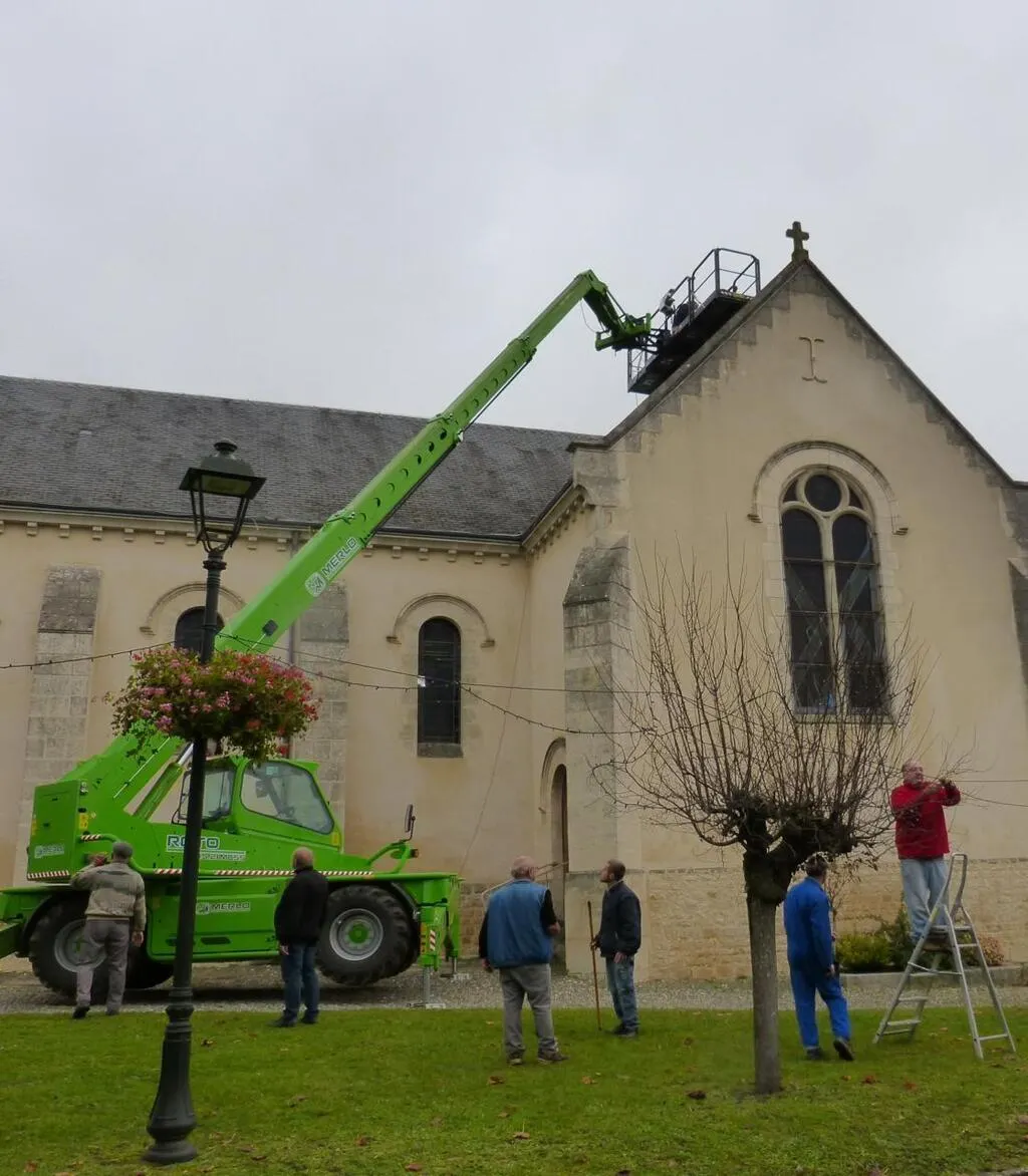 « Cette année nous procédons au remplacement de 400 mètres de cordons lumineux situés sur l’église, ceux qui avaient été mis il y a six ans présentaient des signes de faiblesse, commente Patrick Gosnet maire de la commune. La commission a fait le choix d’un matériel à Leds plus performant et surtout moins gourmand en énergie, et le conseil municipal a approuvé ainsi que l’achat auprès d’un professionnel du Mans. » L’équipe d’une quinzaine de bénévoles s’est donc hissée à 21 mètres de hauteur pour procéder à ce changement.