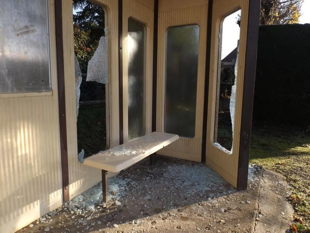 L’abri de bus devant la mairie a été saccagé. © Le Maine Libre