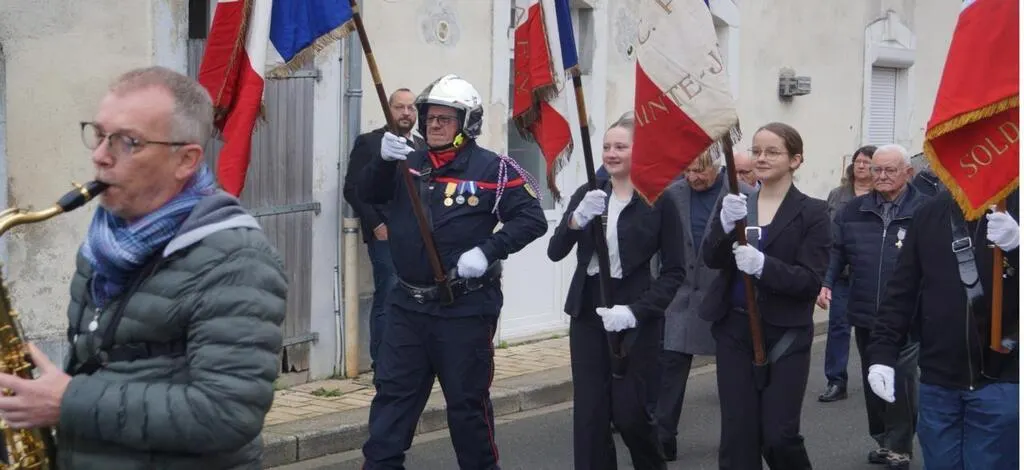 Les habitants du village étaient venus en nombre pour participer à la cérémonie du 11 Novembre, lundi. Deux collégiennes, Louhanne Grudet et Léane Duflos étaient porte-drapeaux, aux côtés des anciens combattants. Une nouveauté, grâce au travail pédagogique de leurs professeurs, en collaboration avec l’armée. © Ouest-France