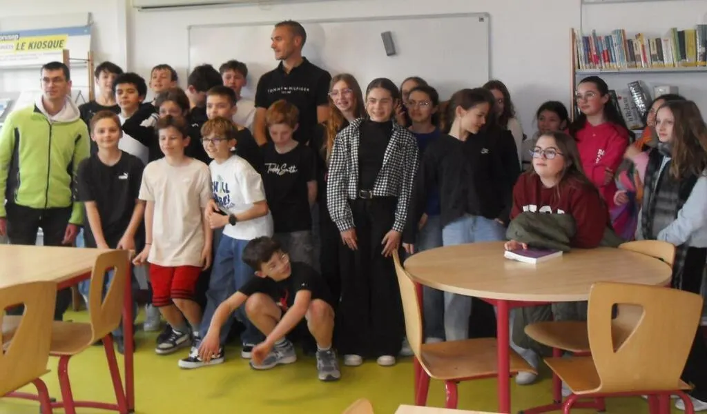 Une des classes de 5e entourant Jérémy (au centre) et Thomas à gauche. © Le Maine Libre