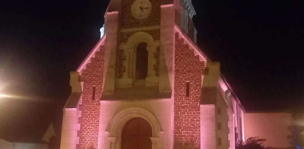 L’église, ainsi que la devanture du salon de coiffure Wendy, situé juste en face, se parent des couleurs d’Octobre rose . Octobre rose est la campagne annuelle de communication destinée à sensibiliser les femmes au dépistage du cancer du sein et à récolter des fonds pour la recherche. © Ouest-France