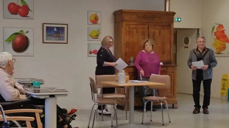 Tous les mois, les bénévoles de la bibliothèque viennent chanter et lire à la maison de retraite du village. Lors de la séance de décembre, ils ont été accompagnés par des lectures en patois sarthois. Des séances appréciées par les résidents qui passent une après-midi de divertissement et de rire. © Ouest-France