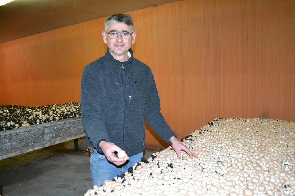 Patrick s’est lancé dans la culture de champignons de Paris dans une ancienne maternité porcine. © Le Maine Libre