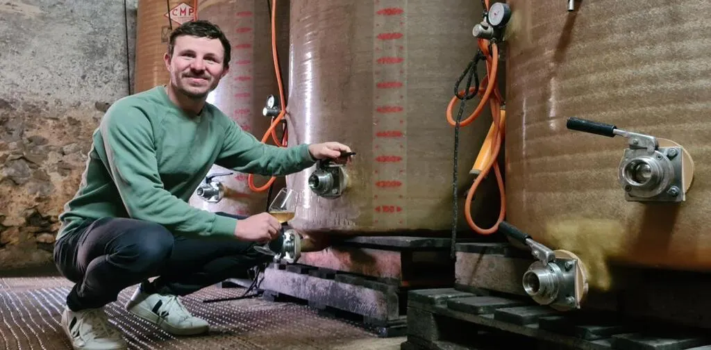 Théo Lhommeau devant les cuves de cidre du domaine. © Ouest-France