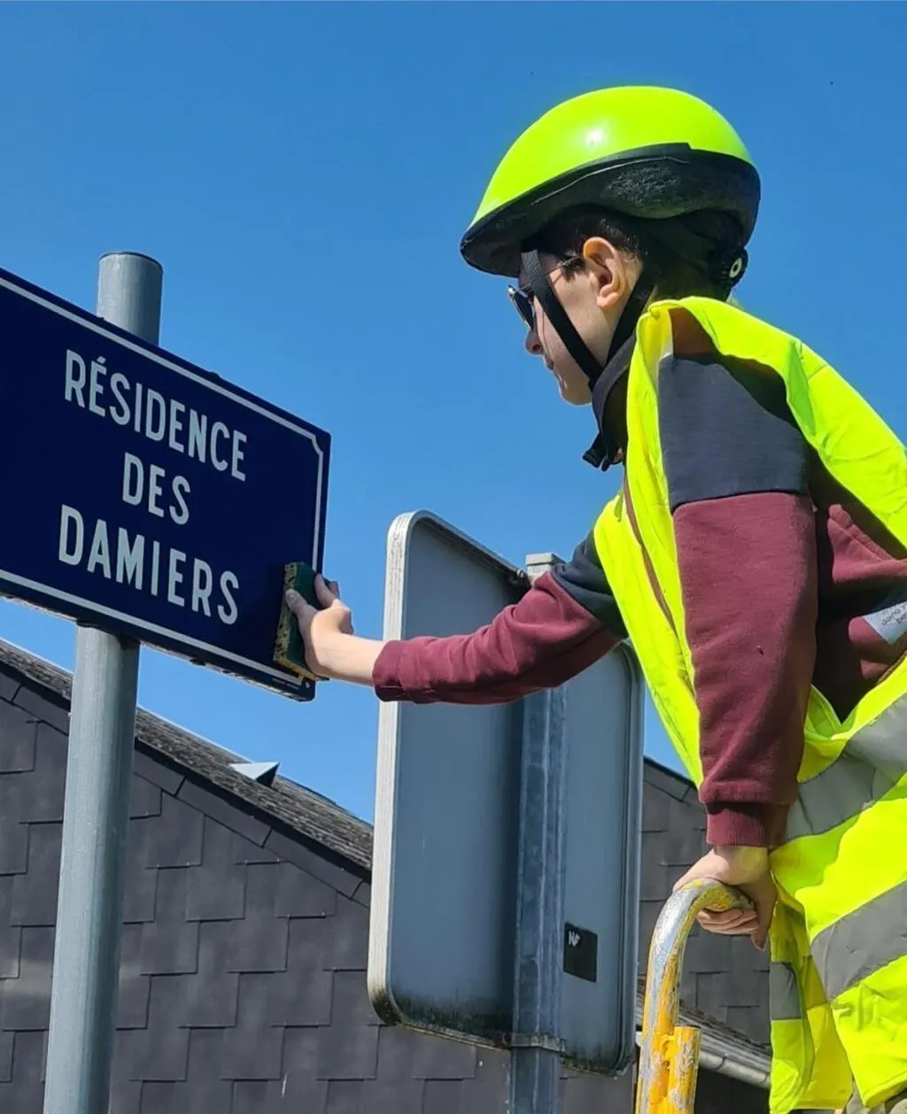 Tout le monde peut participer au nettoyage des panneaux, comme ici, lors de la journée citoyenne 2023. © archives Ouest-France