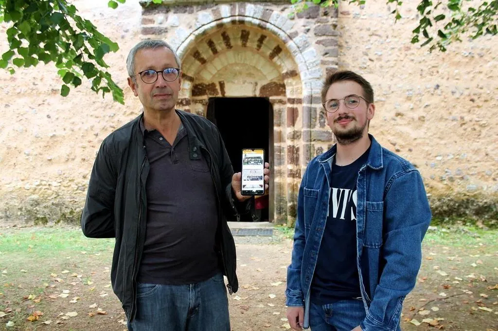 Hervé Delaune, président de l’Association patrimoine d’Asnières, avait dévoilé une toute première mouture de l’application « AppliGuide » avec Maxime Bruant, bénévole, en septembre 2021, devant l’église Saint-Hilaire. © Archives Ouest-France