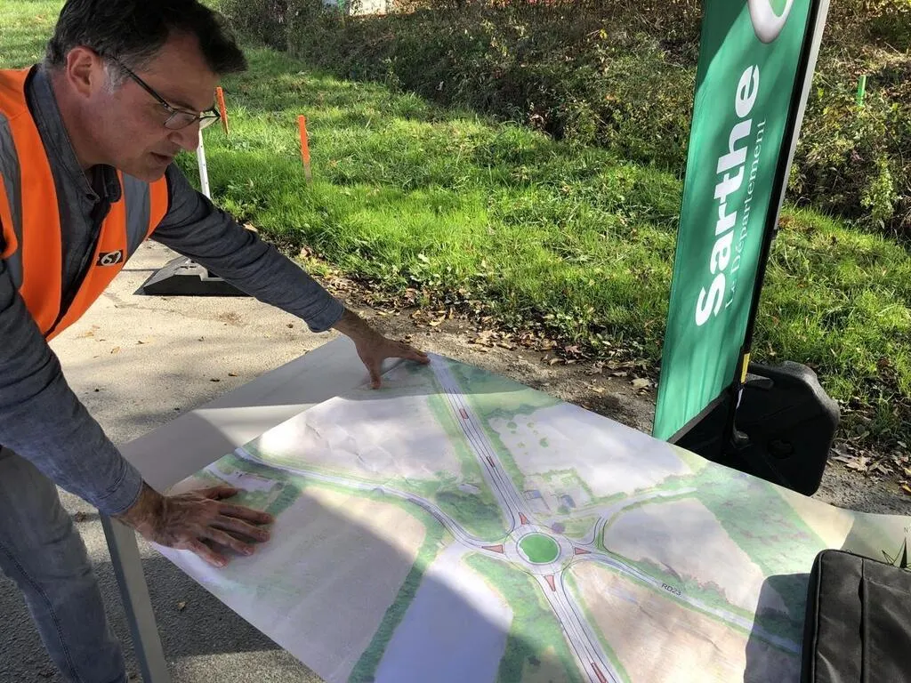 Christian Grosbois, chef du bureau études routières au Conseil départemental de la Sarthe présente le plan de création d’un carrefour giratoire dans la commune du Bailleul. © Ouest-France