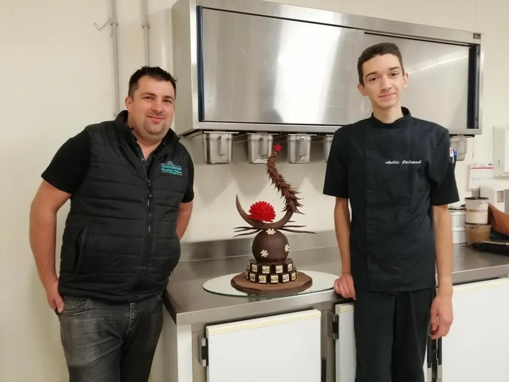 Mathis avec son maître d’apprentissage, Vincent Besnard, de l’Art de la Cabosse au Mans. © Archives Le Maine Libre
