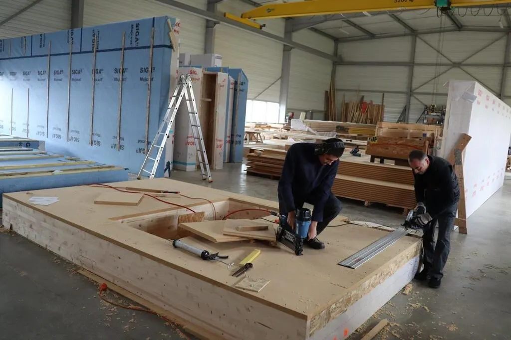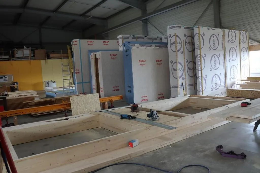 L’entreprise Isopaille, basée à Cherré, dans la Sarthe, est spécialisée dans la construction bois isolée en paille. Les ossatures sont pré-assemblées dans son atelier de 1 200m². © Ouest-France