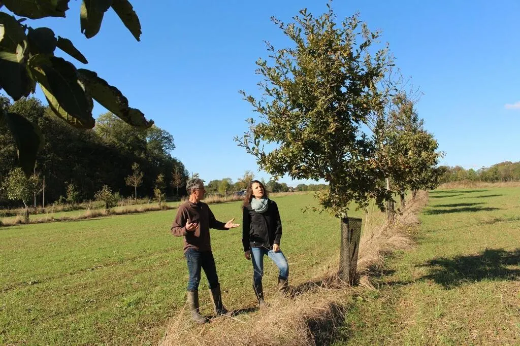 Fyé, samedi 23 octobre 2021. Bertrand Honoré et sa fille Tiphaine Lisa, sur l’une des parcelles plantées selon le principe de l’agroforesterie. © Le Maine Libre