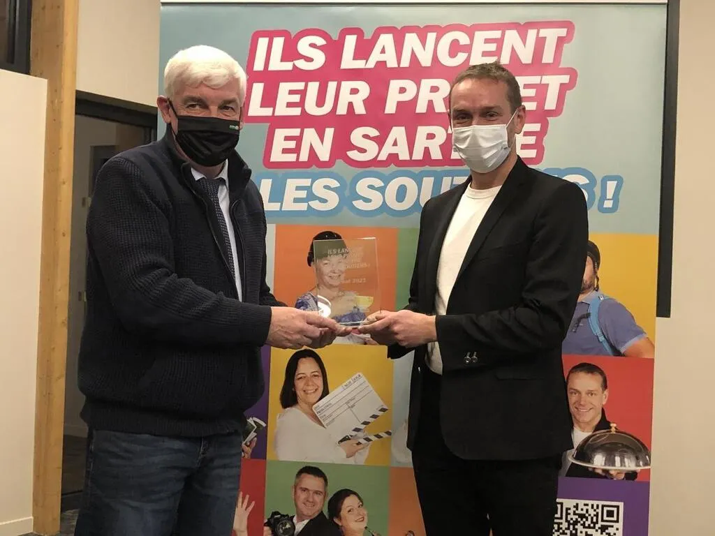 Franck Bernard, récompensé par Patrick Desmazières, conseiller départemental, a récolté 20 500 € de contributions en ligne. Le Maine Libre