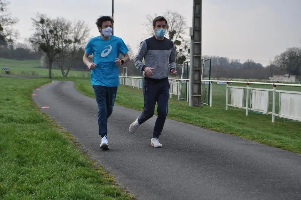 Alexandre Allain (à g.), lors de sa préparation au marathon de Paris en mars 2021, avec son coach sportif. © Archives Le Maine Libre