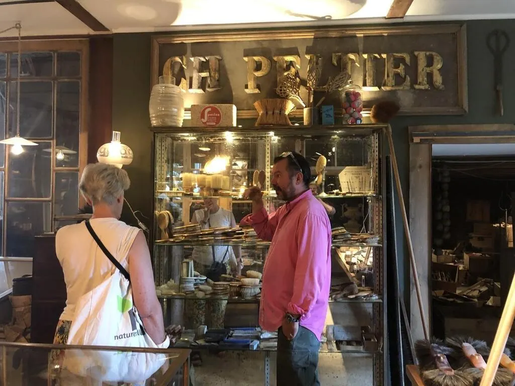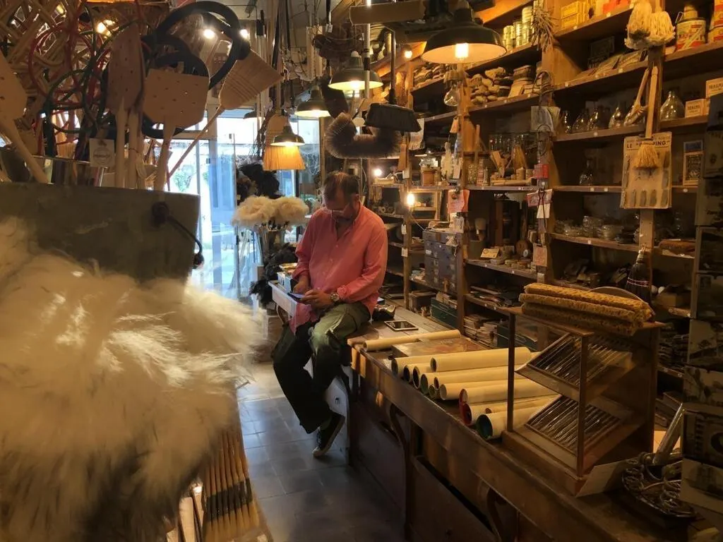 La Chartre-sur-le-Loir, vendredi 19 août 2022. Grégoire Courtin, ici dans la boutique d’un marchand de couleurs d’Angers qu’il a reconstitué, La Palette d’or. © Le Maine Libre