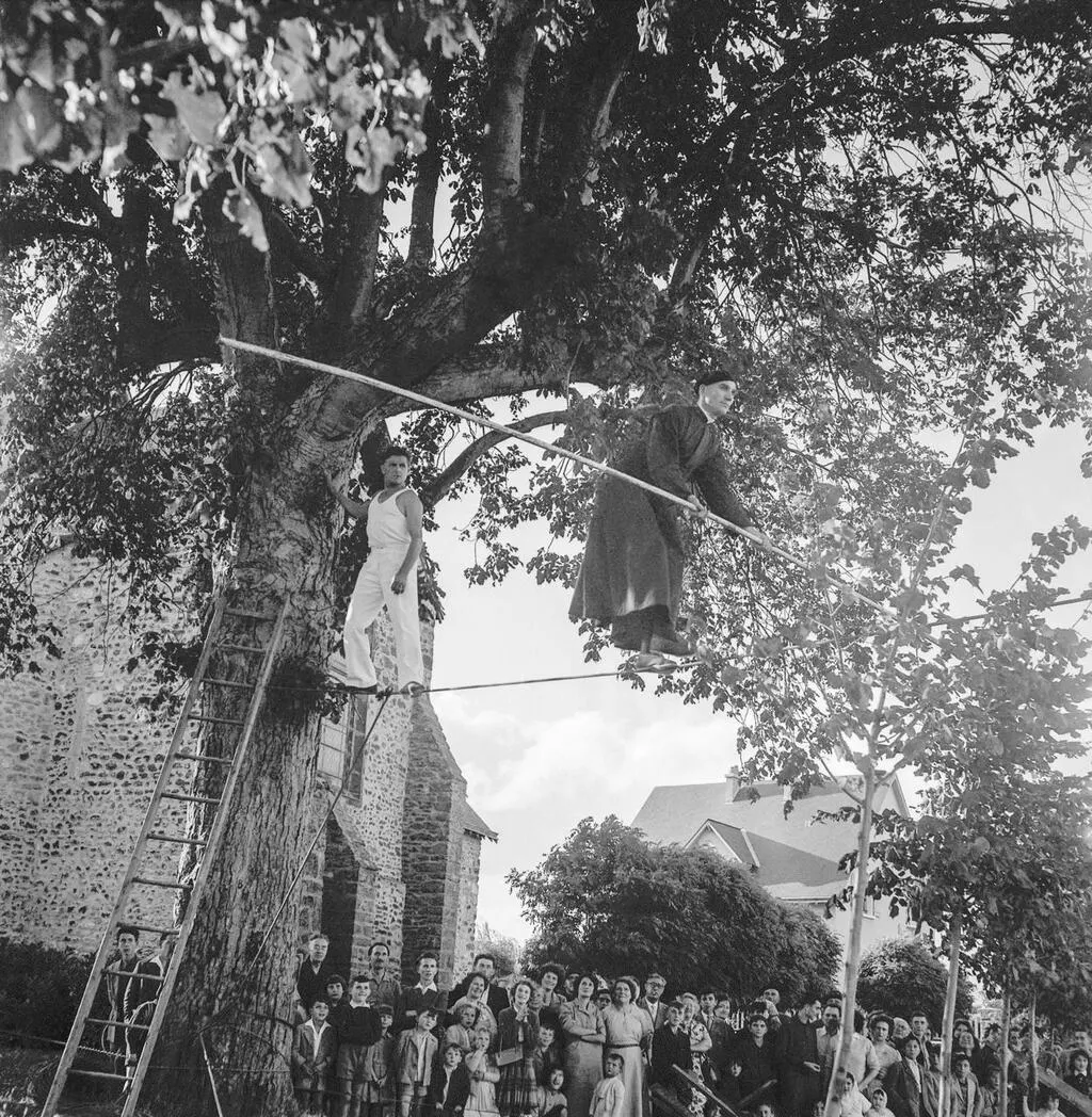 En août 1957, devant l’église de Fillé, l’abbé Baron s’avance avec prudence sur un fil de funambule. Un exploit destiné à financer la réparation de l’église. © AGIP - Bridgeman Images