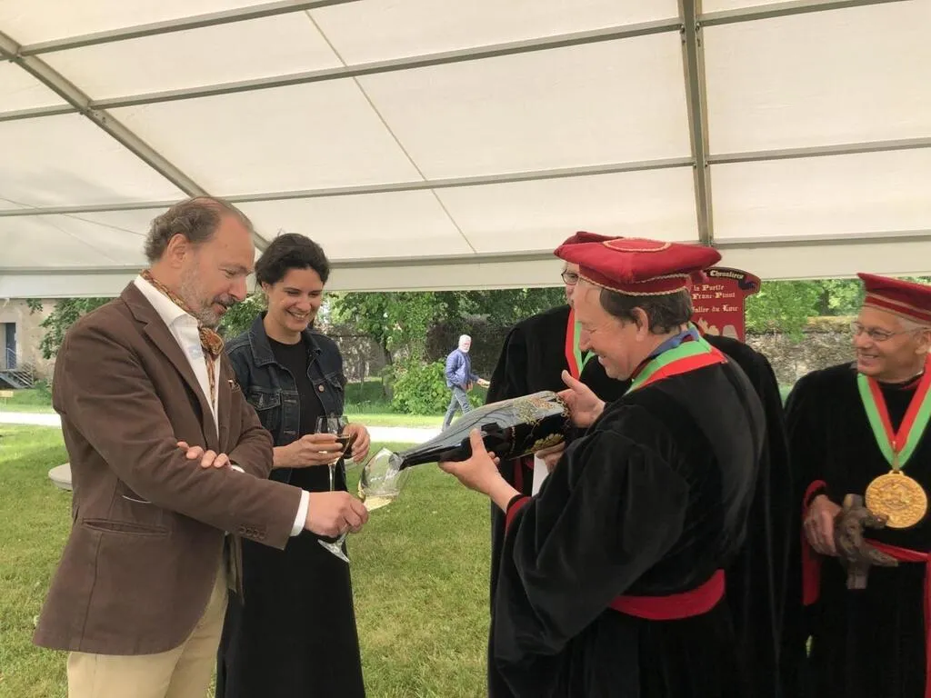 Guy de Malherbe et sa fille Apolline de Malherbe, journaliste et présentatrice de la matinale de la semaine sur RMC sont devenus les ambassadeurs du jasnières et du coteaux-du-loir, lors d’une cérémonie organisée par la confrérie de la Puette et du Franc Pinot, à l’abbaye de l’Épau. © Le Maine Libre