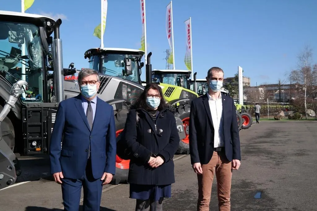 De gauche à droite, Patrick Dallennes, le préfet de la Sarthe, Béatrice Latouche, vice-présidente régionale, et Étienne Bourasseau, directeur industriel de CLAAS Tractor mardi 23 février 2021 sur le site du Mans. © Ouest France