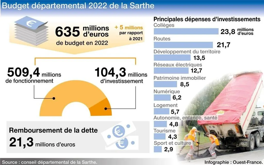 635 millions d’euros. C’est le budget du conseil départemental de la Sarthe pour 2022. Cinq millions de plus qu’en 2021 et 35 millions de mieux qu’en 2020. Plus de 104 millions seront consacrés aux investissements. Auxquels s’ajoutent 291 millions dédiés à des programmes étalés sur plusieurs années.