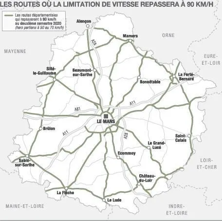 Le département de la Sarthe espère remettre environ 600 km de routes à 90 km/h à partir de juillet 2020. Très empruntée, la RD357 entre Le Mans et Saint-Calais restera limitée à 80 km/h avant et pendant les travaux qui consisteront à créer des créneaux de dépassement.