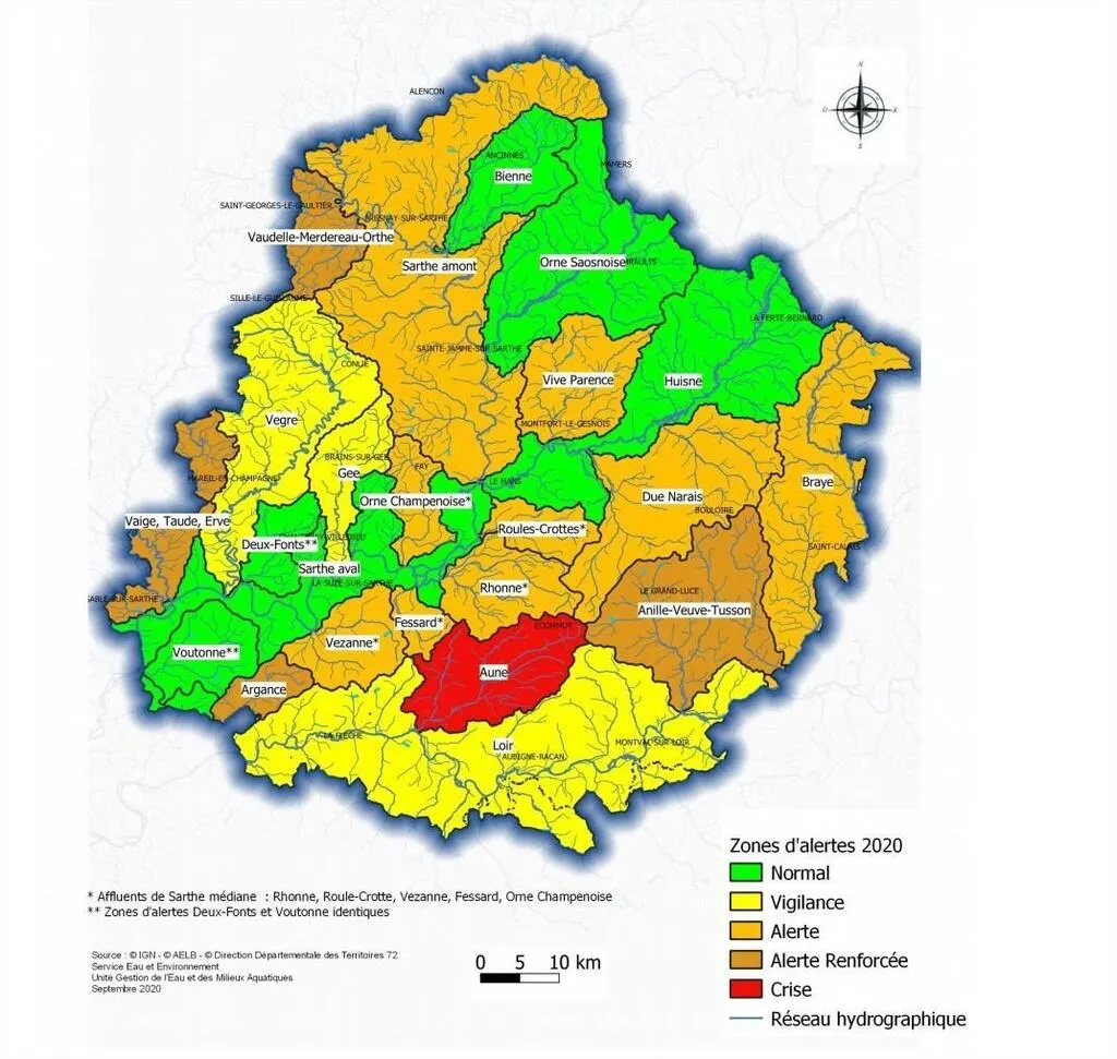 Le bassin-versant de l’Aune (Château-l’Hermitage, Écommoy, Requeil, Marigné-Laillé, Luché-Pringé, Mansigné, Mayet, Pontvallain, Sarcé, Saint-Jean-de-la-Motte, Saint-Biez-en-Belin, Saint-Ouen-en-Belin, Oizé et Yvré-le-Pôlin ) est classé en de zone « crise ».